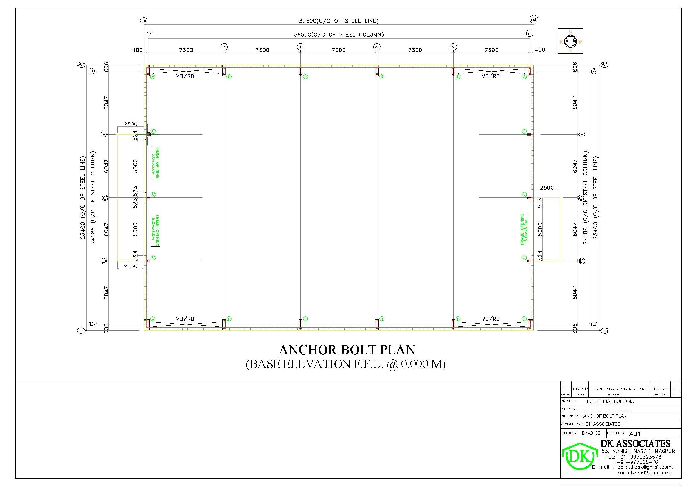 It tells the client / consultant / erector about to set the Anchor Bolts in the site to receive the building. It is usually sent to the client after receipt of approved drawings. Anchor bolt plan is also essential for the final design of foundations. It shows total length and total width of the building, (steel line to steel line dimension), Locations and dimension of all columns, Grid lines and their dimensions, Braced wall locations and other related details.